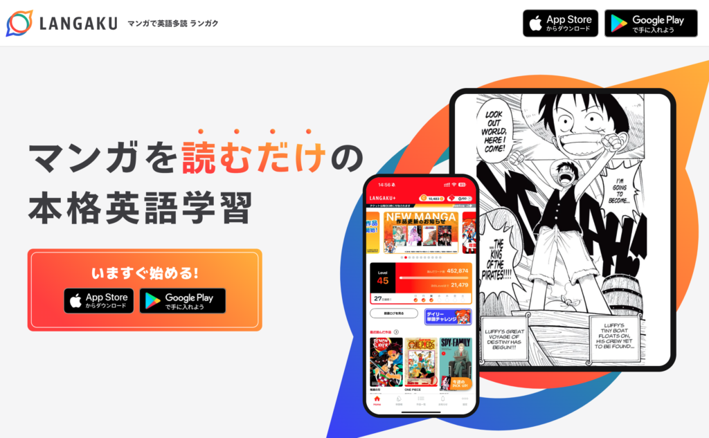 | Langaku | ONE PIECE・鬼滅など日本の人気マンガを英語で読める。英語と日本語の割合調整やタップ辞書、音声機能が便利。 |