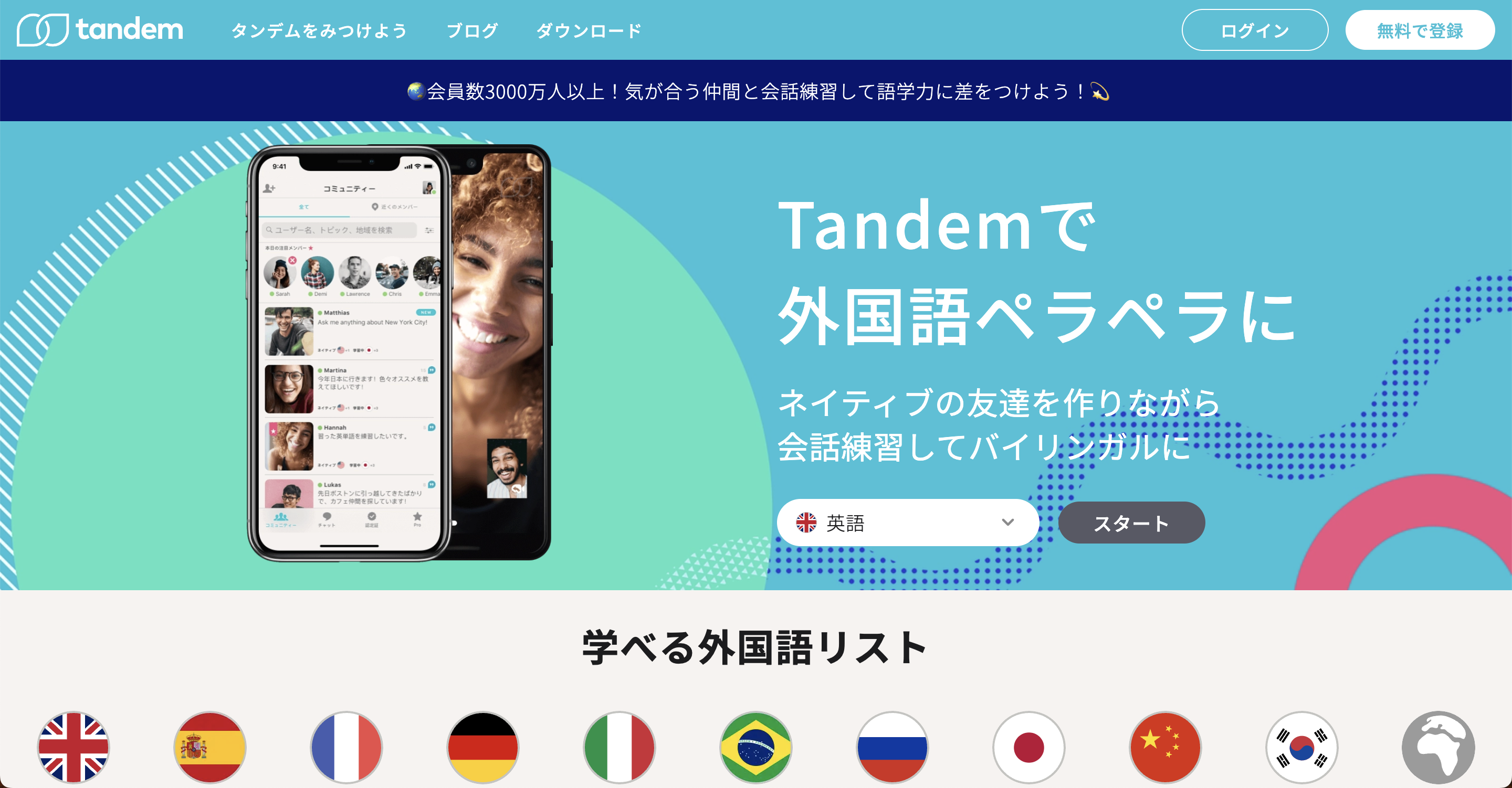 「Tandem」は会員数3,000万人以上を誇る、ヨーロッパ発の言語交換アプリです。HelloTalkと並ぶ人気アプリですが、比較すると「より真面目に学習したい人」が多い傾向です。