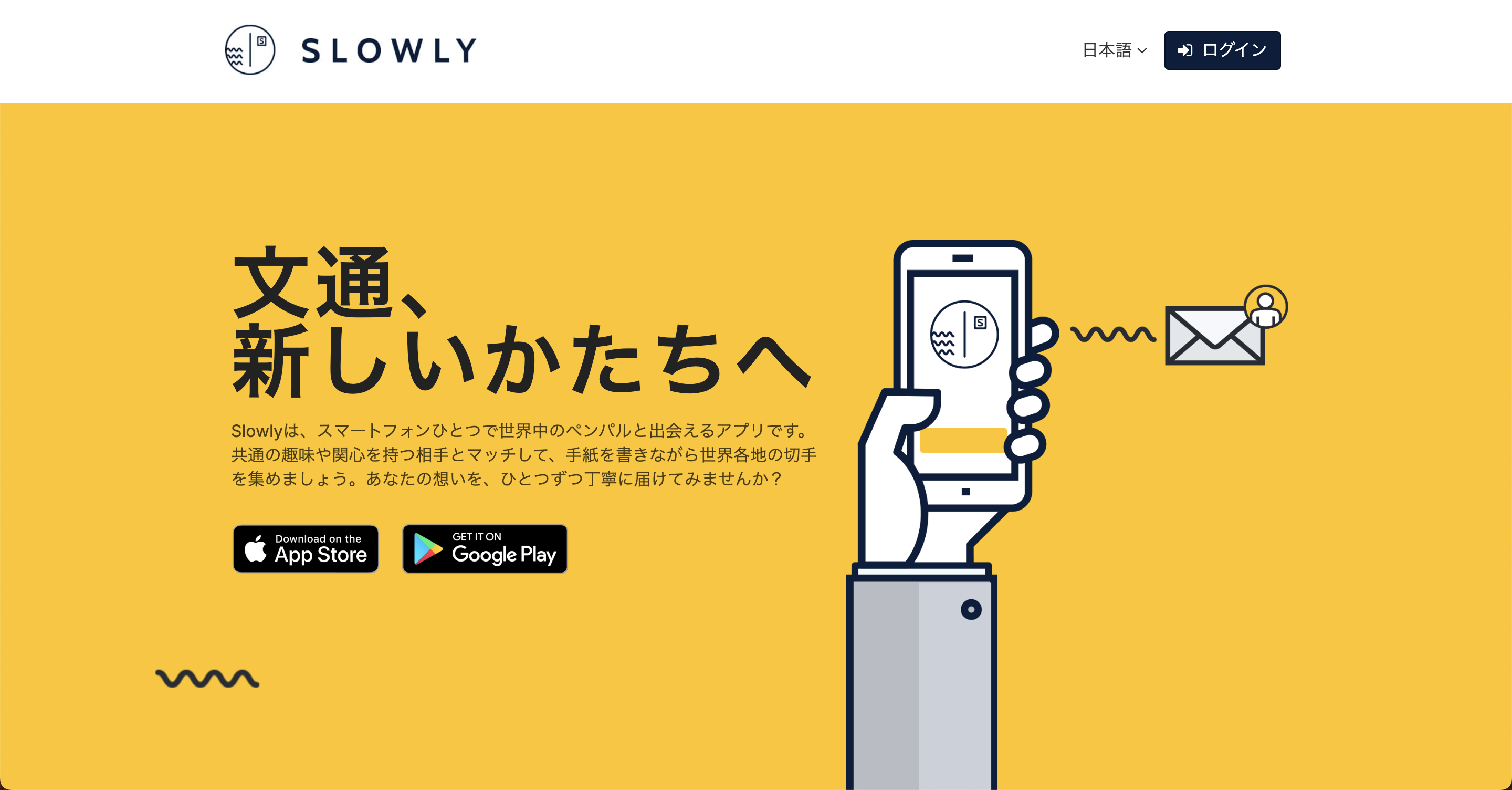 デジタル文通アプリ、距離に応じて配達時間が変化、匿名性が高く内面重視 匿名利用可能、位置情報は国レベルまで 文章を書くのが好きな人、ゆっくり深い関係を築きたい人