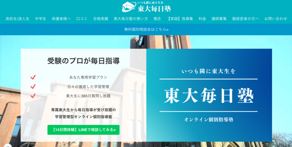 東大毎日塾は、「いつも隣に東大生を」をコンセプトに掲げる、完全オンライン型の個別指導塾です。代表の内田悠斗氏自身が埼玉県の公立校から予備校なしで東大に現役合格した経験をもとに、2020年にサービスを立ち上げました。