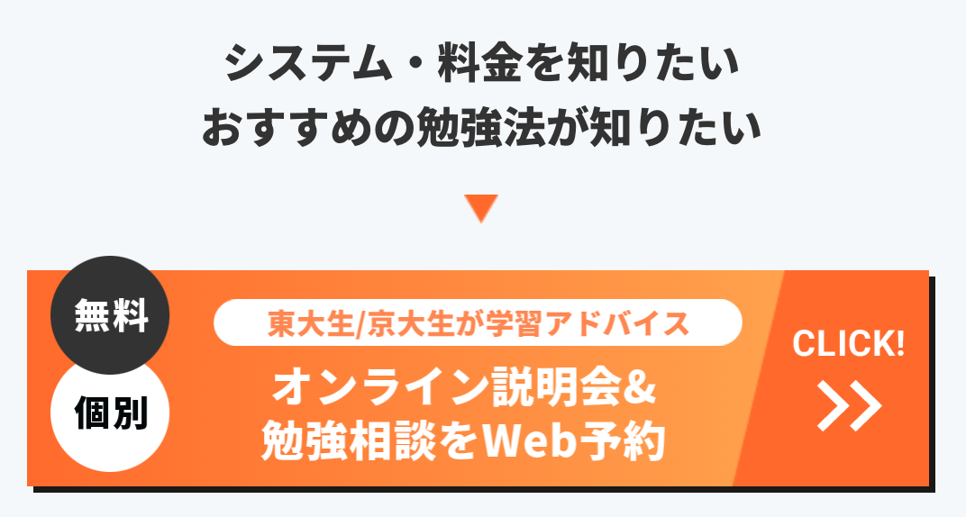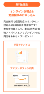 • 無料勉強相談に参加すると、Amazonギフト券500円と東大/京大式学習アドバイスがもらえる