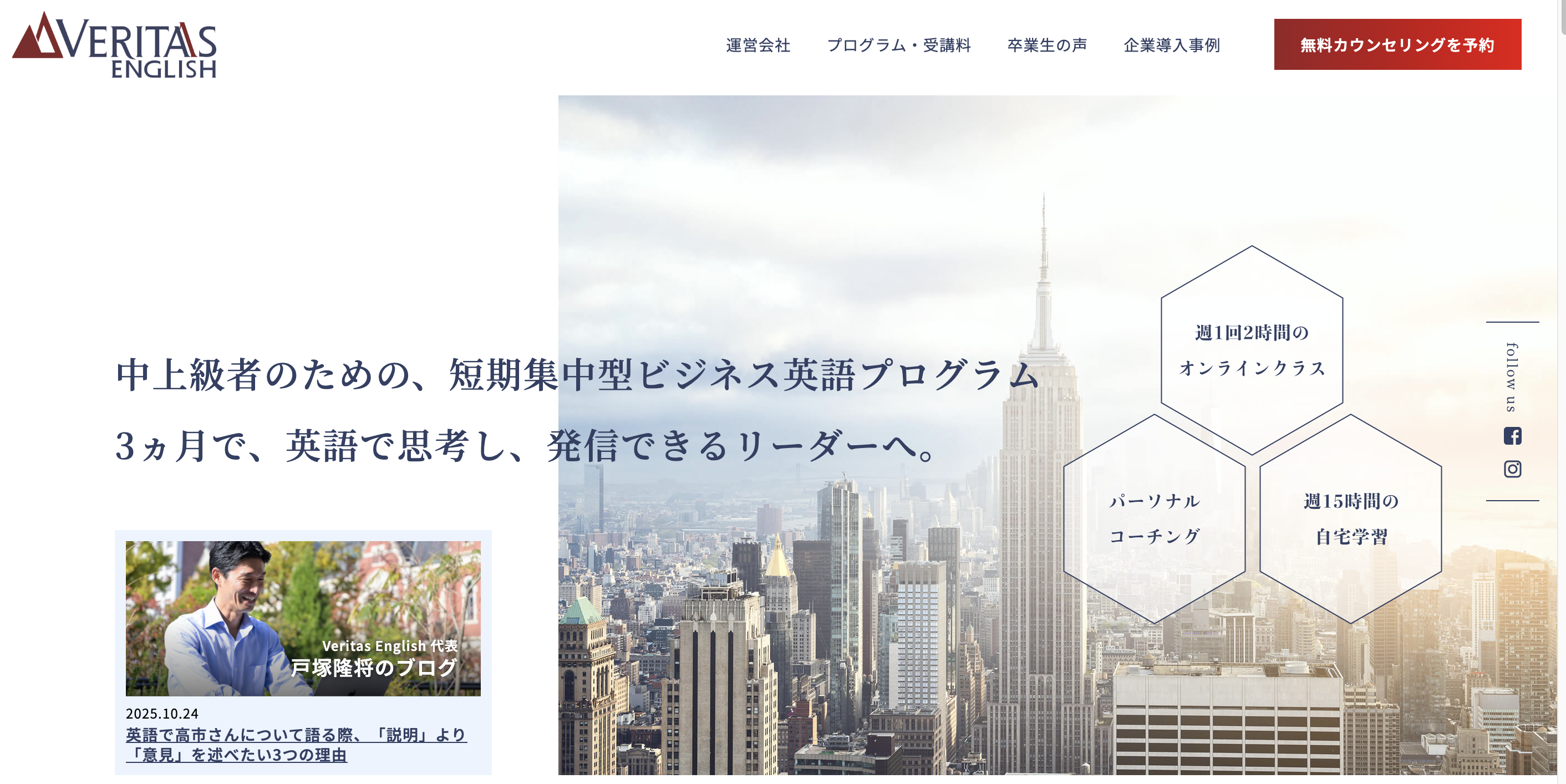 ベリタスイングリッシュは、ハーバードMBA x ゴールドマン x マッキンゼー出身の戸塚隆将氏が立ち上げた短期集中型ビジネス英語プログラムです。