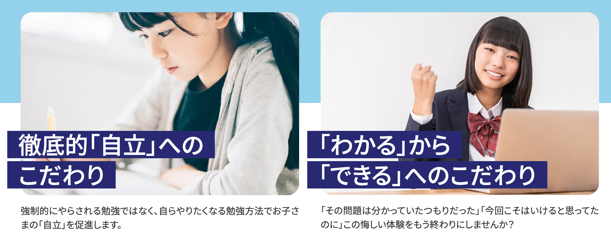 銀河が公式サイトで掲げているのが「自立にこだわる教育」です。「わからない」→「わかる」→「できる」という3ステップを意識した指導で、生徒が自分で勉強に向かうようになることを最終的な目標としています。