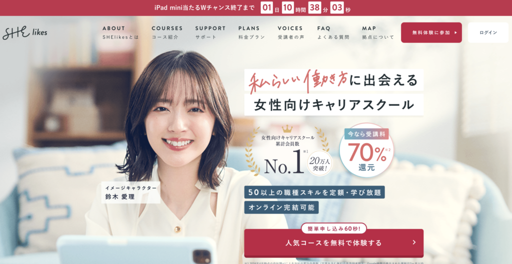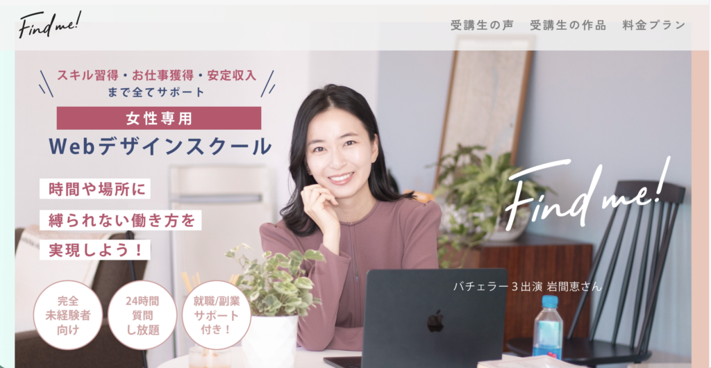- 女性向け → SHElikes(月額10,780円〜・入会金別途・50種類以上のコース)・Find me!(月額4,980円〜・入学金別途・女性限定)