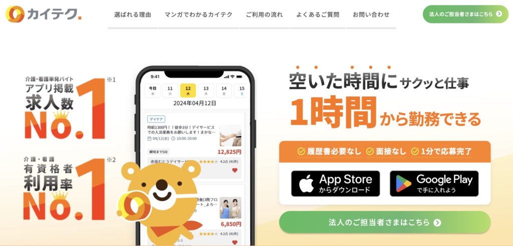 カイテクは、カイテク株式会社が運営する介護・看護・保育の有資格者向け単発バイトアプリです。面接や履歴書なしで、スマホひとつで仕事に応募でき、勤務当日に給与を受け取ることができます。