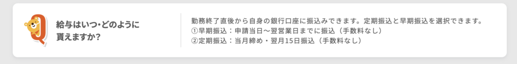 | 給与 | 最速1分で振込、急な出費にも対応できて助かる |