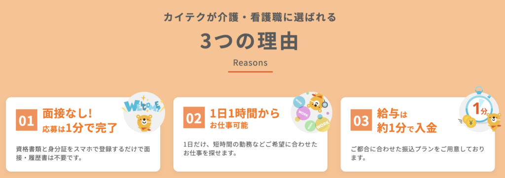 隙間時間に介護・看護の資格を活かして稼ぎたい方、転職先を探しながら収入を得たい方、ブランク明けに少しずつ現場に慣れたい方には、カイテクは非常に使い勝手のよいサービスです。