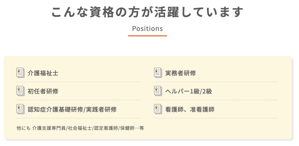 介護福祉士・実務者研修・初任者研修・ヘルパー1級・ヘルパー2級・認知症介護基礎研修・社会福祉士・理学療法士・作業療法士・言語聴覚士・介護支援専門員(ケアマネジャー)・喀痰吸引等研修など